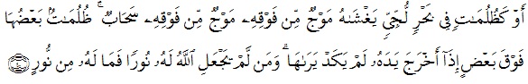 “Atau seperti gelap gulita di lautan yang dalam, yang diliputi oleh ombak, yang di atasnya ombak (pula), di atasnya (lagi) awan; gelap gulita yang tindih-bertindih, apabila dia mengeluarkan tangannya, tiadalah dia dapat melihatnya, (dan) barang siapa yang tiada diberi cahaya (petunjuk) oleh Allah tiadalah dia mempunyai cahaya sedikit pun.” (QS An Nuur: 40).