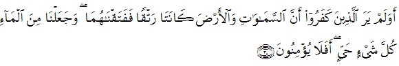 “Dan apakah orang-orang yang kafir tidak mengetahui bahwasanya langit dan bumi itu keduanya dahulu adalah suatu yang padu, kemudian Kami pisahkan antara keduanya. Dan dari air Kami jadikan segala sesuatu yang hidup. Maka mengapakah mereka tiada juga beriman?” (Al Qur’an, 21:30)