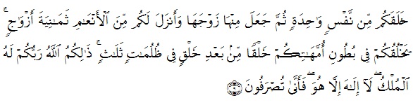 “Dia menciptakan kamu dari seorang diri kemudian Dia jadikan daripadanya isterinya dan Dia menurunkan untuk kamu delapan ekor yang berpasangan dari binatang ternak. Dia menjadikan kamu dalam perut ibumu kejadian demi kejadian dalam tiga kegelapan[1]. Yang (berbuat) demikian itu adalah Allah, Tuhan kamu, Tuhan Yang mempunyai kerajaan. Tidak ada Tuhan (yang berhak disembah) selain Dia; maka bagaimana kamu dapat dipalingkan?”