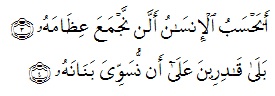 “Apakah manusia mengira, bahwa Kami tidak akan mengumpulkan (kembali) tulang belulangnya?” “Bukan demikian, sebenarnya Kami kuasa menyusun (kembali) jari jemarinya dengan sempurna.”