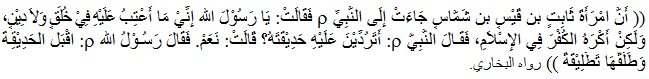 “Bahwa istri Tsabit bin Qais bin Syammas datang kepada Nabi shallallahu ‘alaihi wa sallam dan berkata: “ Ya Rasulullah, sungguh aku tidak mencelanya dalam akhlak maupun agamanya, tetapi aku takut akan kekafiran dalam Islam” Nabi shallallahu ‘alaihi wa sallam bertanya: “ Maukah kamu mengembalikan kebunnya kepadanya? Wanita itu menjawab: “Ya, Rasulullah shallallahu ‘alaihi wa sallam bersabda: (kepada suaminya): “Terimalah kebun itu, dan ceraikanlah ia" ( HR.Al Bukhari ).