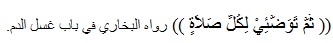 “Kemudian berwudhulah setiap kali hendak shalat (HR. Al Bukhari, Bab: membersihkan darah).