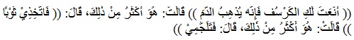 “Aku beritahukan kepadamu (untuk menggunakan) kapas, karena hal itu dapat menyerap darah”. Hamnah berkata: “darahnya lebih banyak dari pada itu, beliau Bersabda: “Gunakan kain!” Kata Hamnah: Darahnya masih banyak pula” Nabipun bersabda: “Maka pakailah penahan!”