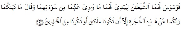 Maka syaitan membisikkan pikiran jahat kepada keduanya untuk menampakkan kepada keduanya apa yang tertutup dari mereka yaitu auratnya dan syaitan berkata: "Tuhan kamu tidak melarangmu dari mendekati pohon ini, melainkan supaya kamu berdua tidak menjadi malaikat atau tidak menjadi orang-orang yang kekal (dalam surga)." (Qs. Al-A’raaf : 20)