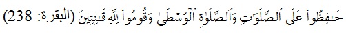 Peliharalah segala salat (mu), dan (peliharalah) salat wusthaa. Berdirilah karena Allah (dalam salatmu) dengan khusyuk. (QS. Al-Baqarah: 238)
