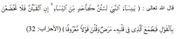 Hai istri-istri Nabi, kamu sekalian tidaklah seperti wanita yang lain, jika kamu bertakwa. Maka janganlah kamu tunduk dalam berbicara sehingga berkeinginanlah orang yang ada penyakit dalam hatinya,dan ucapkanlah perkataan yang baik, (QS.Al-Ahzab: 32.)