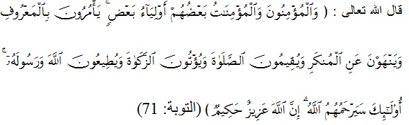 Dan orang-orang yang beriman, lelaki dan perempuan, sebahagian mereka (adalah) menjadi penolong bagi sebahagian yang lain. Mereka menyuruh (mengerjakan) yang makruf, mencegah dari yang mungkar, mendirikan sembahyang, menunaikan zakat, dan mereka taat kepada Allah dan Rasul-Nya. Mereka itu akan diberi rahmat oleh Allah; sesungguhnya Allah Maha Perkasa lagi Maha Bijaksana. (QS. Al-Taubah: 71.)