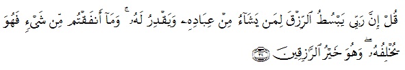 Katakanlah: "Sesungguhnya Tuhanku melapangkan rezeki bagi siapa yang dikehendaki-Nya di antara hamba-hamba-Nya dan menyempitkan bagi (siapa yang dikehendaki-Nya)". Dan barang apa saja yang kamu nafkahkan, maka Allah akan menggantinya dan Dia lah Pemberi rezeki yang sebaik-baiknya. (QS. Saba’: 39)