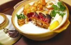 3. Didihkan kaldu bebek dan garam. Tambahkan beras. Masak sambil diaduk sampai matang.