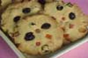 7. Masukkan sebagian manisan ceri merah, ceri hijau dan kismis, aduk sampai merata.