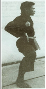 Gerakan / Kiraan 1Berdirilah dengan tegap dan kaki rapat, seperti ketika akan mengawali jurus satu. Kemudian ambil nafas yang dalam dengan perlahan melalui hidung dan tahanlah di dalam dada. Bersamaan dengan itu, buatlah posisi kuda-kuda tengan (ongkong-ongkong) dan letakkan kedua tangan di samping pinggang. Tarik kedua tangan anda itu ke belakang bersama dengan tarikan nafas, pergelangan tangan harus menempel/rapat pada pinggang dan hujung-hujung jari menghadap ke bawah. (Perhatikan gambar di atas ).