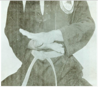 Dengan tetap menahan nafas, turunkan tangan anda ( kedua telapak tangan tetap saling menempel/dirapatkan ) dan tariklah siku tangan kiri di samping tubuh sebelah kiri. Pusatkan seluruh kekuatan pada kedua telapak tangan.
