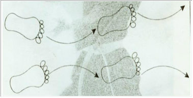 Pada waktu menggeser kaki ke depan, kaki harus tetap menempel pada tanah/lantai ( tidak boleh diangkat ). Geseran kaki ke depan harus dilakukan dengan gerakan silang, tidak lurus. Perhatikan skets di bawah ini :