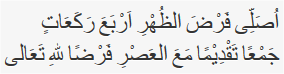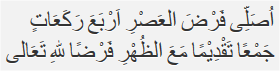 ”Ushalli fardhadh dhuhri arba'a raka'aatin jam'an taqdhiman ma'al ashri fardhal-lillaahi-ta'aala”