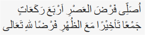 ”Ushalli fardhal 'ashri arba'a raka'aatin jam'an ta'khiiran ma'adh-dhuhri fardhal-lillaahi-ta'aala”