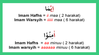 Warsyih untuk hukum Mad Badal, boleh dibaca panjang hingga 6 harakat.