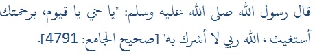 " Wahai Dzat yang Maha Hidup lagi berdiri sendiri, dengan kasih sayangMu saya memohon pertolonganMu, Allah Rabbku, yang aku tidak menyekutukan denganNya". Shahuhul Jami' no: 4791.