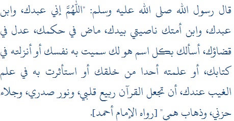"Ya Allah, sesungguhnya aku ini adalah hambaMu, anak dari hambaMu (laki-laki), anak dari hambaMu (perempuan), ubun-ubunku berada di tanganMu, mengikuti keputusan takdirMu dan berjalan sesuai dengan ketetapanMu. Aku memohon kepadaMu dengan setiap nama yang menjadi milikMu, nama yang Engkau lekatkan sendiri untuk diriMu, atau yang Engkau sebutkan dalam kitabMu, atau yang Engkau ajarkan kepada salah seorang di antara hambaMu (Nabi), atau yang Engkau sembunyikan di alam keghaibanMu, hendaknya Engkau menjadikan al-Qur'an ini sebagai penyejuk hatiku, cahaya dalam dadaku, penghilang kesedihanku danpenolak rasa gundahku". HR Ahmad