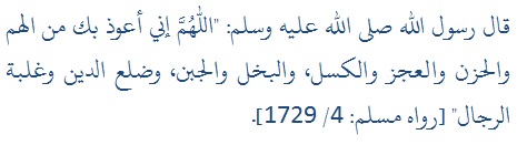 "Ya Allah saya berlindung denganMu dari kesulitan dan kesedihan, dari ketidak mampuan dan kemalasan, dari sikap bakhil dan pengecut, dari terlilit hutang dan di kuasai orang lain". HR Muslim no: 1729.