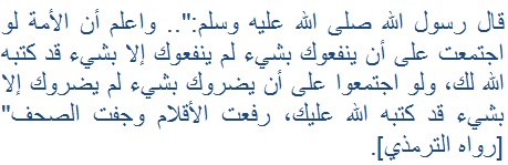 "Ketahuilah kalau sekiranya umat ini bersatu untuk memberi sesuatu manfaat kepadamu maka itu tidak akan bermanfaat bagimu melainkan dengan sesuatu yang memang sudah di tentukan oleh Allah Ta'ala bagimu, (dan begitu juga) kalau sekiranya umat ini berkumpul untuk memberi bahaya padamu maka tidak akan berbahaya kepadamu melainkan dengan sesuatu yang memang sudah di tentukan oleh Allah Ta'ala padamu, telah di angkat pena, dan telah kering catatan tersebut". HR Tirmidzi.