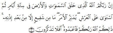 "Sesungguhnya Tuhan kamu ialah Allah yang menciptakan langit dan bumi dalam enam masa, kemudian Dia bersemayam di atas 'Arsy untuk mengatur segala urusan. tiada seorangpun yang akan memberi syafa'at kecuali sesudah ada izin-Nya. (Dzat) yang demikian Itulah Allah, Tuhan kamu, Maka sembahlah Dia. Maka Apakah kamu tidak mengambil pelajaran?". QS Yunus: 3.