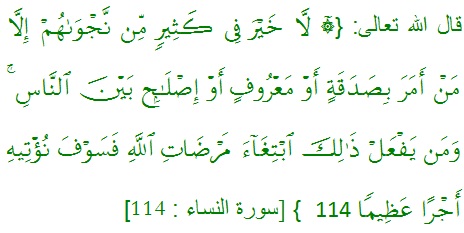 "Tidak ada kebaikan pada kebanyakan bisikan-bisikan mereka, kecuali bisikan-bisikan dari orang yang menyuruh (manusia) memberi sedekah, atau berbuat ma'ruf, atau mengadakan perdamaian di antara manusia. dan barangsiapa yang berbuat demikian karena mencari keridhoan Allah, maka kelak Kami memberi kepadanya pahala yang besar". QS an-Nisaa': 114.