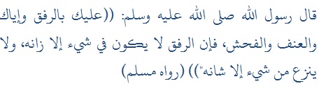 "Berbuatlah dengan lembut lembut dan jauhi olehmu permusuhan dan perbuatan keji, sesungguhnya tidaklah lemah lembut itu di letakan pada suatu perkara melainkan ia pasti akan menghiasinya, dan tidaklah di cabut lemah lembut tersebut dari suatu perkara melainkan akan menjadikan jelek". HR Muslim.