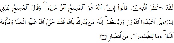 “Sesungguhnya telah kafirlah orang-orang yang berkata: "Sesungguhnya Allah ialah Al masih putera Maryam", Padahal Al masih (sendiri) berkata: "Hai Bani Israil, sembahlah Allah Tuhanku dan Tuhanmu". Sesungguhnya orang yang mempersekutukan (sesuatu dengan) Allah, Maka pasti Allah mengharamkan kepadanya surga, dan tempatnya ialah neraka, tidaklah ada bagi orang-orang zalim itu seorang penolongpun..”(al-Maaidah:72)