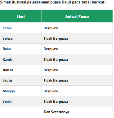 Atau jika diawali dengan hari senin puasa, maka hari selasa tidak puasa, nanti hari rabu melakukan puasa kembali dan hari kamis tidak puasa lagi, begitu seterusnya.