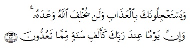 “Dan mereka meminta kepadamu agar azab itu disegerakan, padahal Allah sekali-kali tidak akan menyalahi janji-Nya. Sesungguhnya sehari di sisi Tuhanmu adalah seperti seribu tahun menurut perhitunganmu.” (QS Al Hajj: 47)